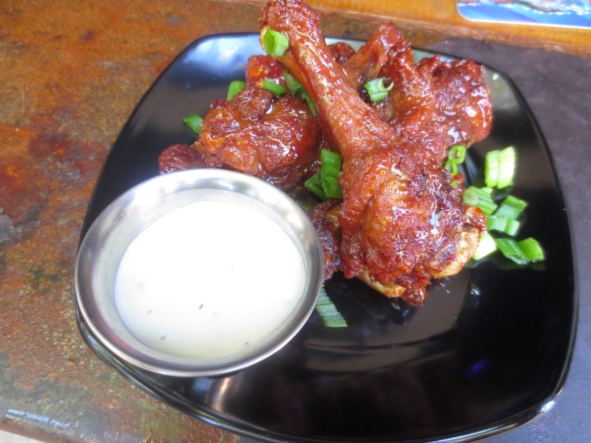 ...but the "World Famous" (and, yes...I consider that self-proclamation to be justly deserved) Duck Wings, which are actually drumsticks, left me positively starry-eyed. I tried the succulent drummies sauced two ways...Orange Habanero, which catapulted me into the throes of hot flash nirvana in the best of all possible ways; and the wimpier, but equally delightful, sticky honey and garlic application.